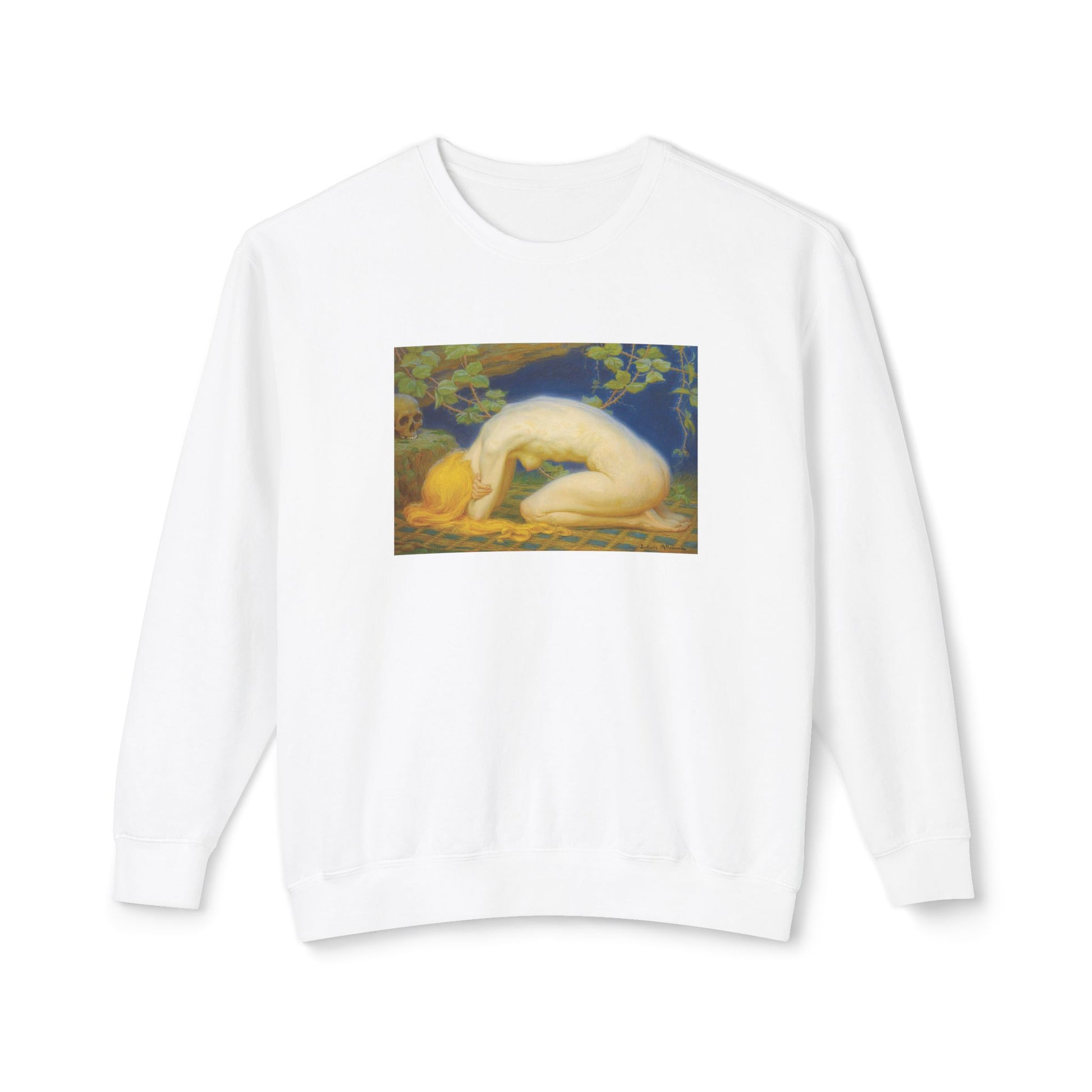 Marie Madeleine (1896) by Ludovic Alleaume blends religious subject matter with the dramatic movement of Art Nouveau. The figure’s serene expression, delicate drapery, and ornate halo-like framing give the work a spiritual yet decorative beauty, harmonizing sacred imagery with modern design sensibilities. Wear its allure with apparel inspired by its image.
