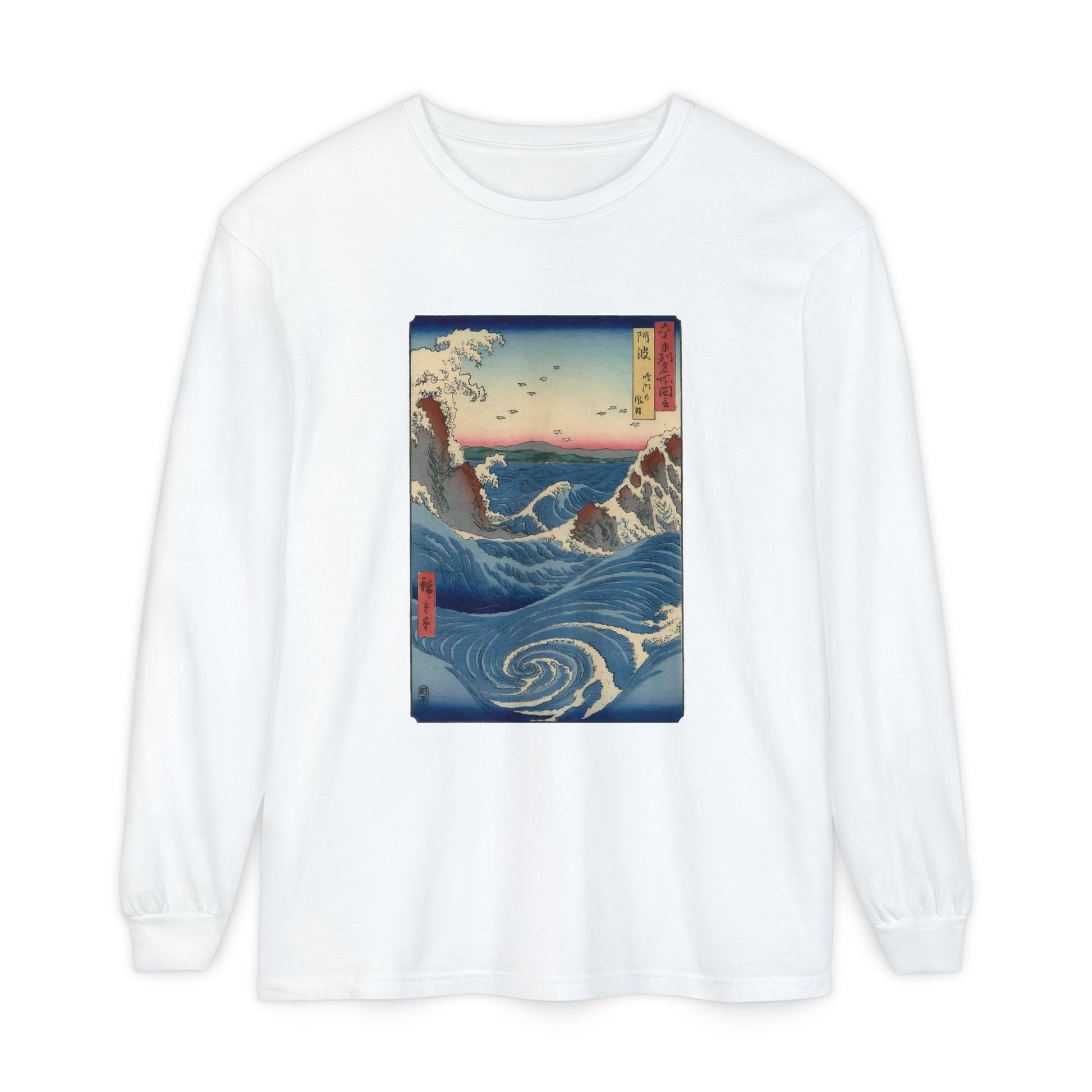 Utagawa Hiroshige’s Awa no Naruto no Fūha (Whirlpool at Awa, c. 1855) depicts the swirling tides of the Naruto Strait rendered with rhythmic lines and delicate blues. As a master of landscape ukiyo-e, Hiroshige brought poetry and motion to nature scenes, influencing Western artists like Van Gogh. Embrace the calm energy of the whirlpool with art-inspired clothing that moves with you.