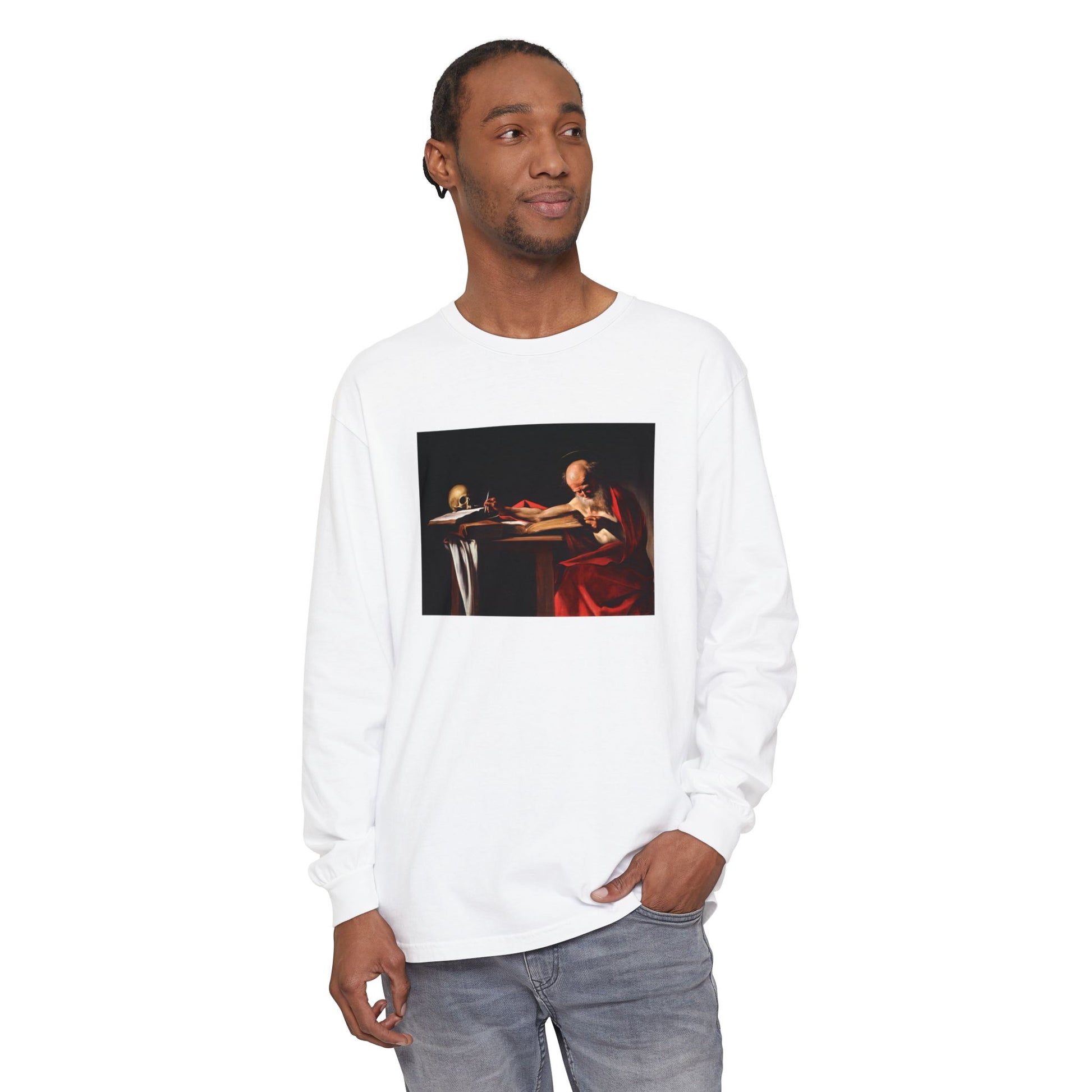 Saint Jerome Writing by Caravaggio, painted in the early 17th century (c. 1605–1606), shows the saint deep in concentration as he translates the Bible. This work exemplifies the Baroque style, with its striking use of chiaroscuro and intense realism that draws the viewer into the saint’s solitary devotion. Wear the intense focus of Saint Jerome through apparel inspired by Caravaggio's masterful work.