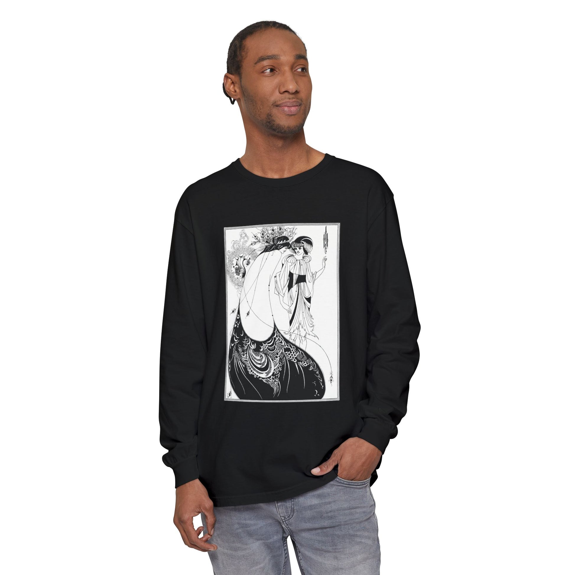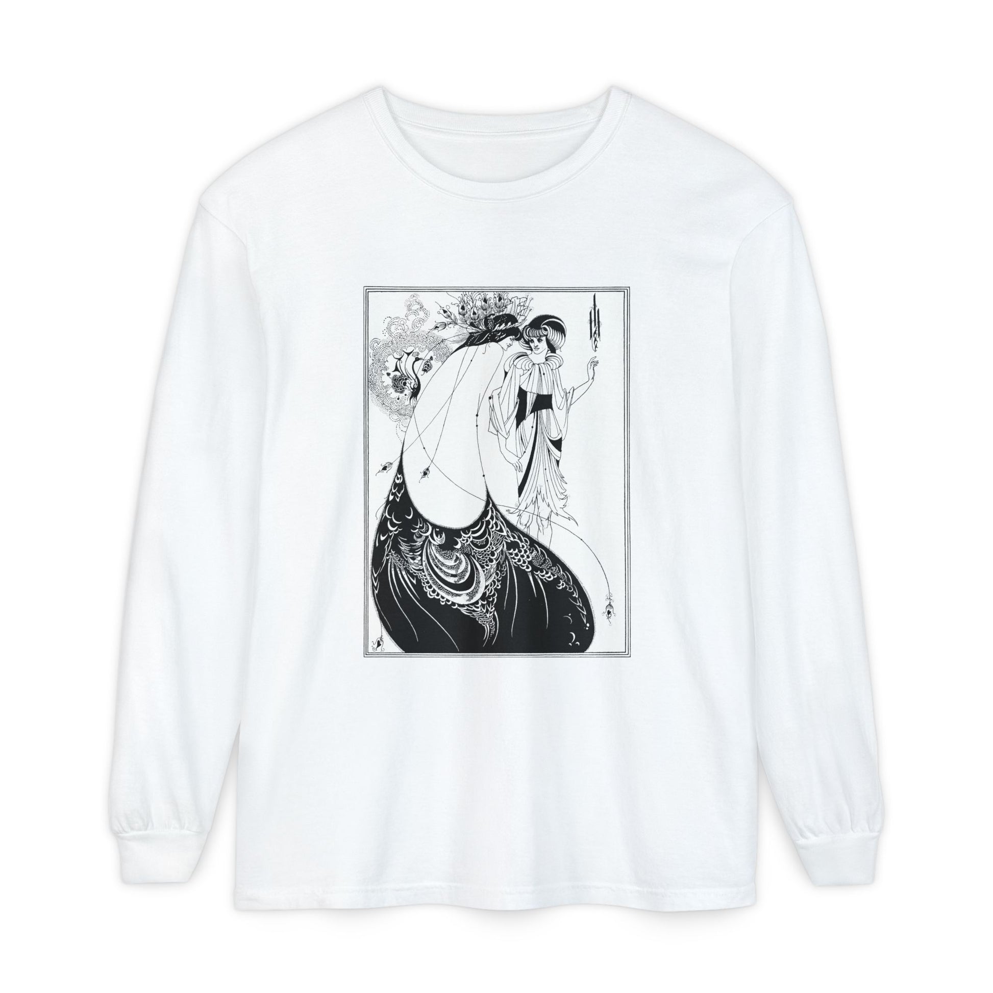 The Peacock Skirt (1894) by Aubrey Beardsley was created as an illustration for Oscar Wilde’s play Salomé. The bold black-and-white design, intricate patterns, and sensuous forms became a hallmark of Beardsley’s decadent style within Art Nouveau. Wear its graphic brilliance with apparel inpired by Beardsley's work.