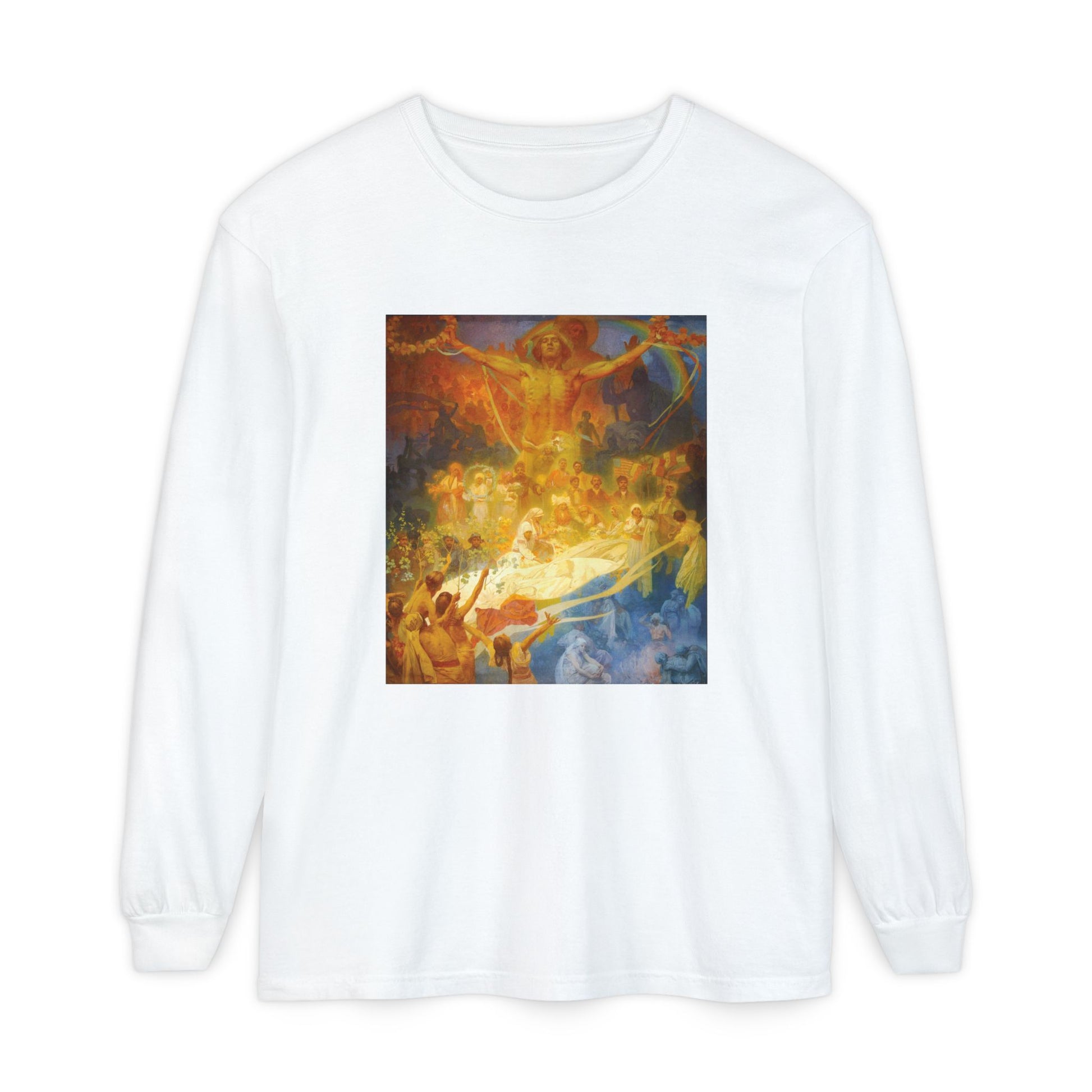 The Slav Epic: Apotheosis (1926) is part of Mucha’s monumental series celebrating Slavic unity. Painted on a grand scale, it fuses allegory, history, and Art Nouveau’s decorative grace. The glowing central figures, surrounded by flowing banners and symbolic imagery, create a vision of cultural pride and resilience. Fuse art and heritage in your apparel with prints of this epic composition.