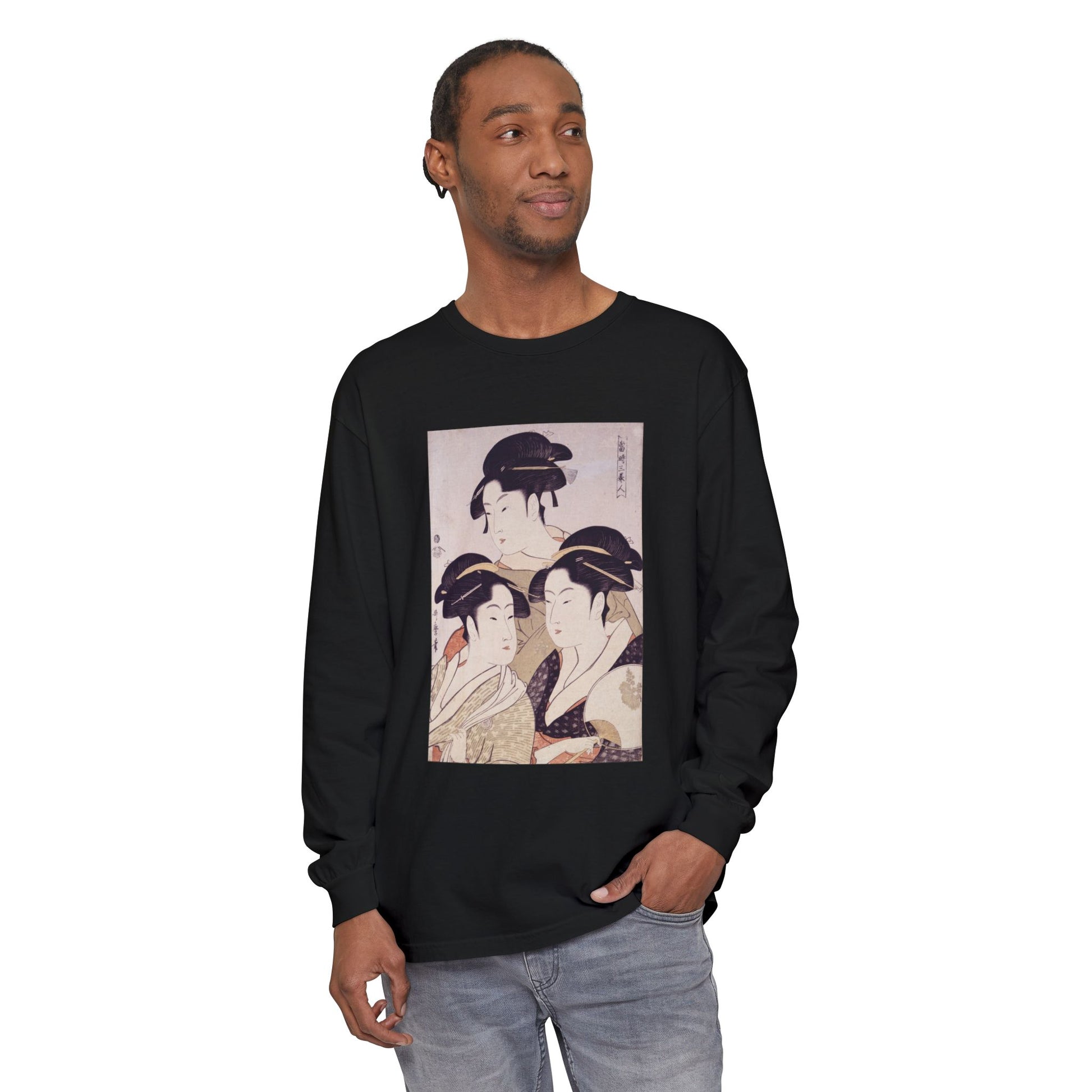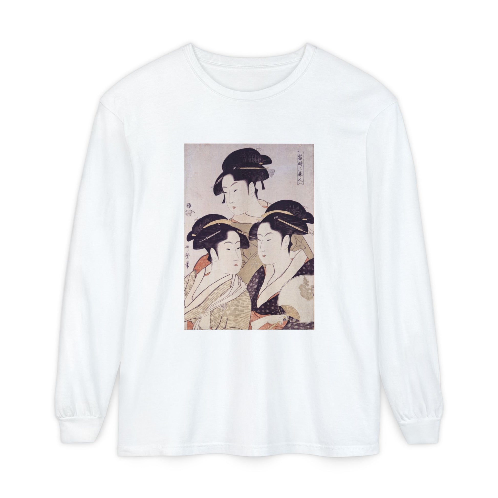 Kitagawa Utamaro’s Tōji San Bijin (Three Beauties of the Present Day, c. 1793) portrays three celebrated courtesans in a graceful triangular composition. Utamaro was famed for his bijin-ga (pictures of beautiful women), which defined the genre and influenced fashion and beauty ideals during the Edo period of Japan. Celebrate beauty with clothing that brings this graceful scene to life.