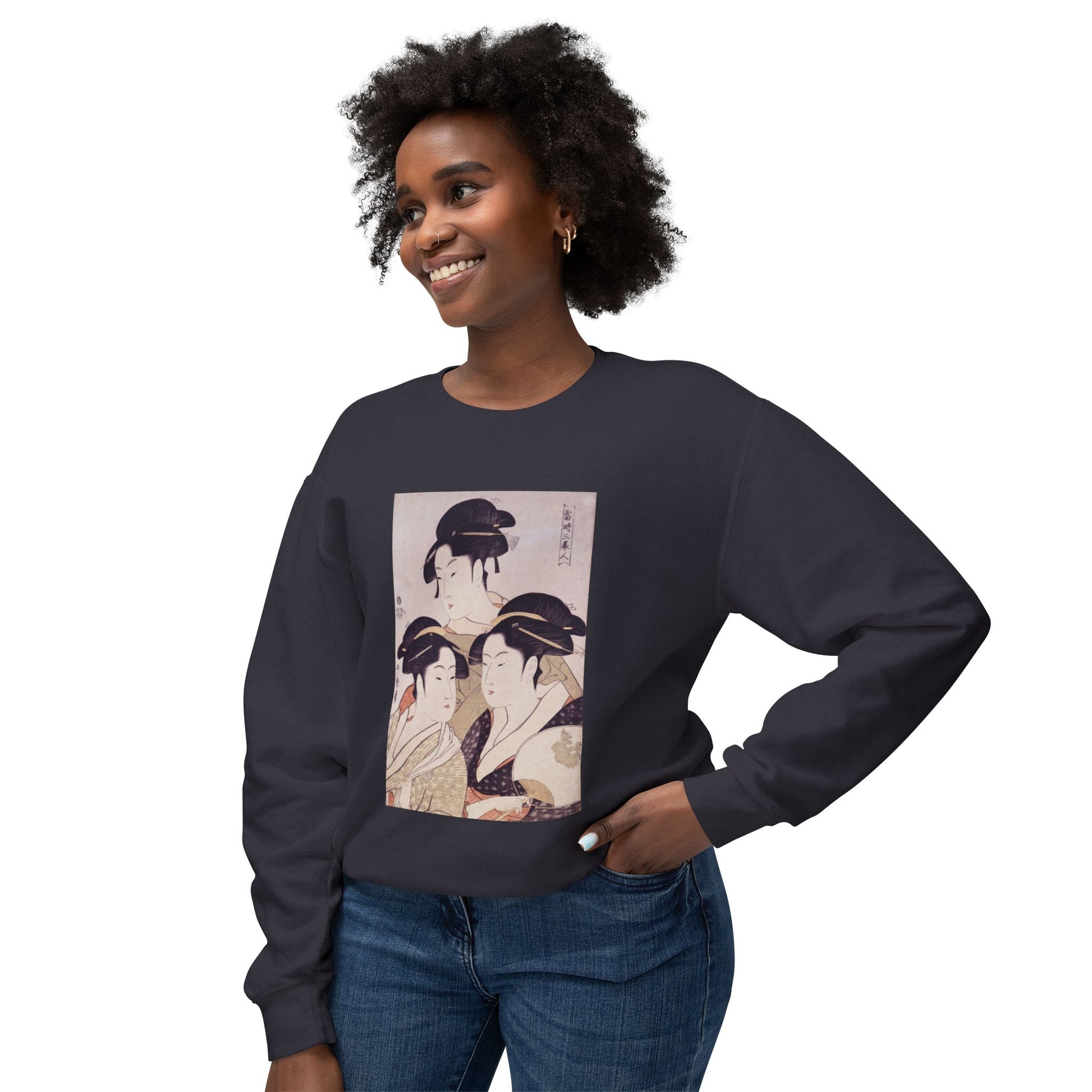 Kitagawa Utamaro’s Tōji San Bijin (Three Beauties of the Present Day, c. 1793) portrays three celebrated courtesans in a graceful triangular composition. Utamaro was famed for his bijin-ga (pictures of beautiful women), which defined the genre and influenced fashion and beauty ideals during the Edo period of Japan. Celebrate beauty with clothing that brings this graceful scene to life.